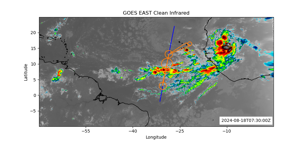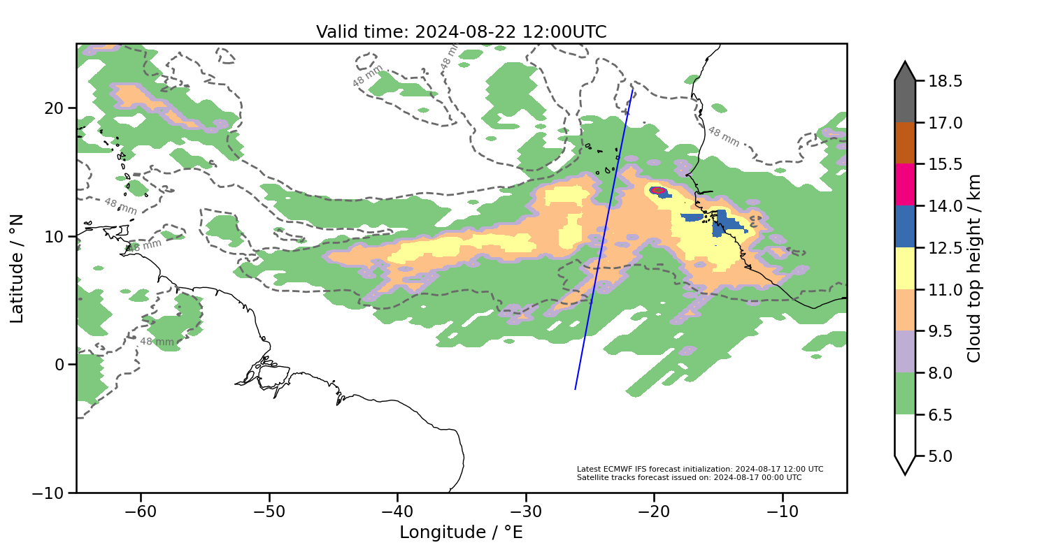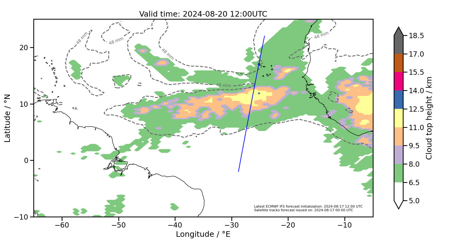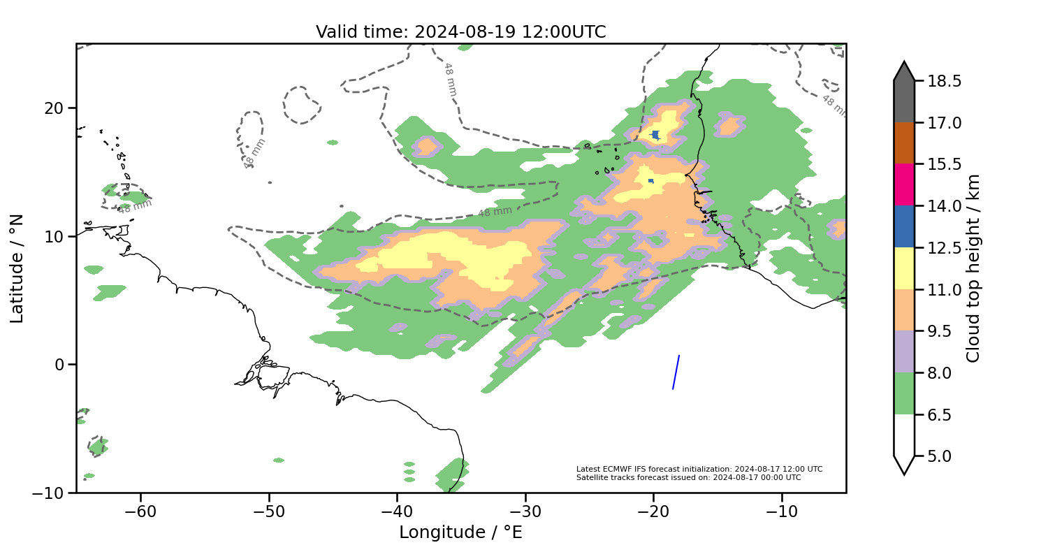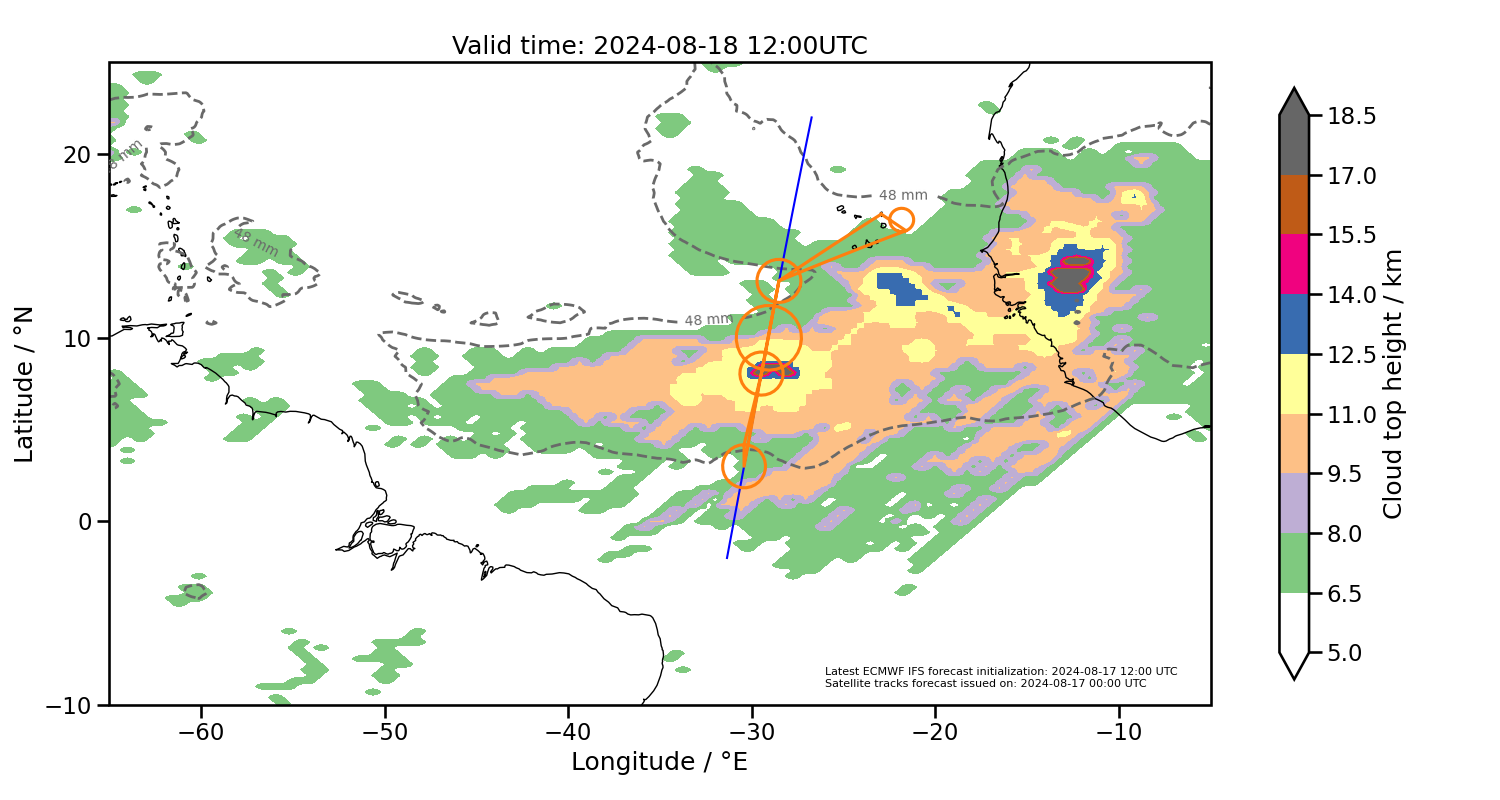 High cloud tops reaching about 15km in the centre circle & cloud circle